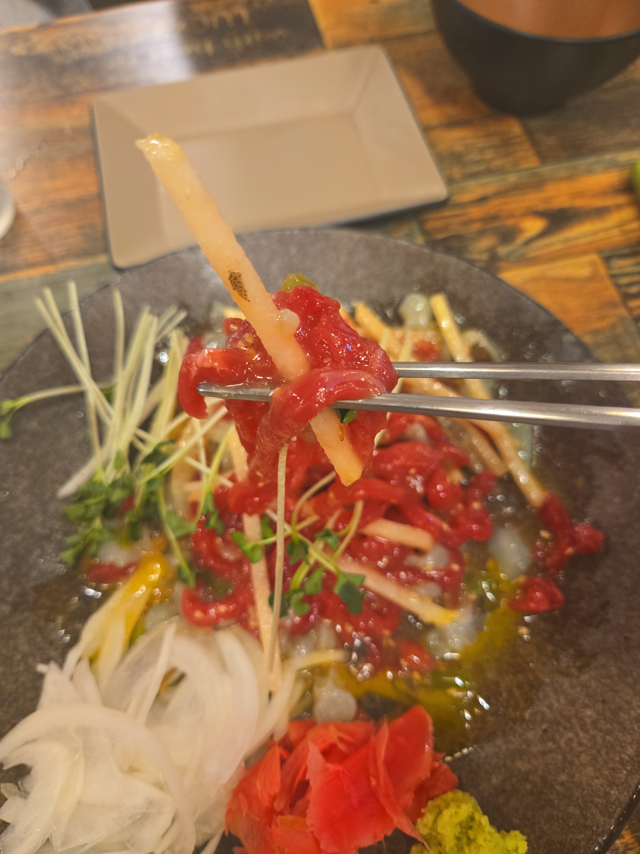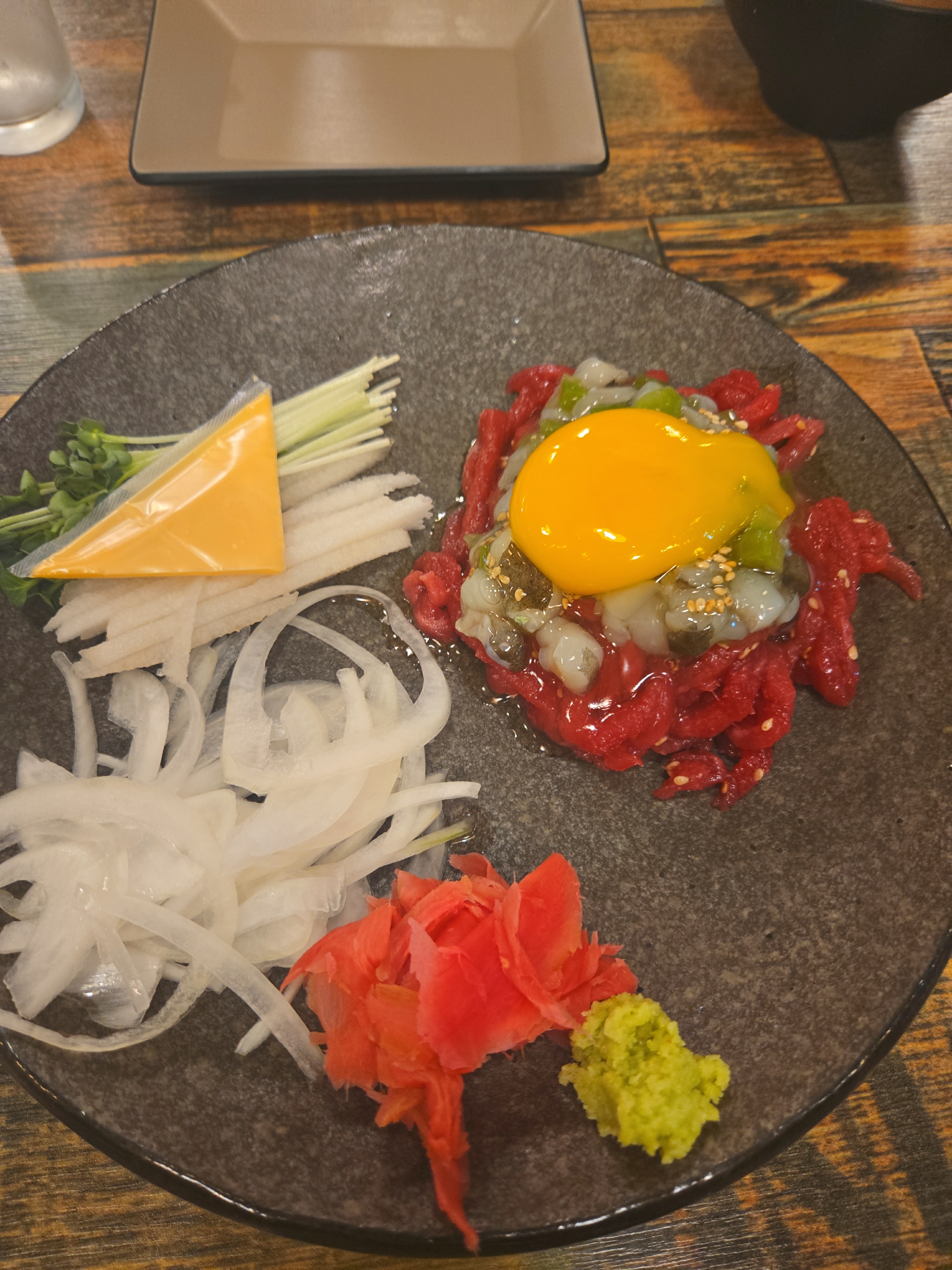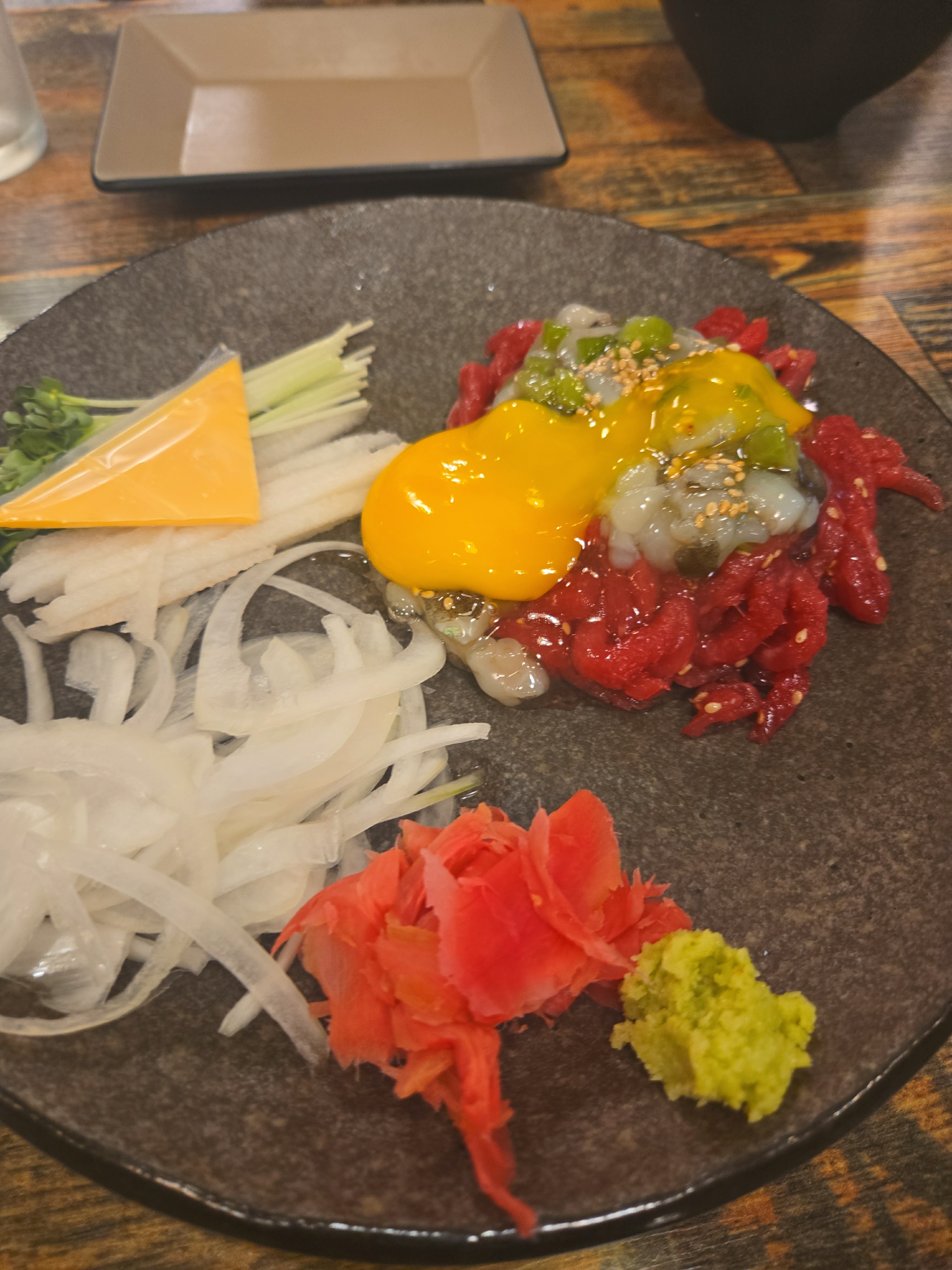 보기에도 아주 땟깔이 좋죠? 저희는 육회와 낙지 탕탕이를 같이 먹을 수 있는걸 선택했어요 약간 톡쏘면서 참 맛나네요~ 여기 사장님이 육회에 진심인듯 합니다. 육회바른연어는 육회를 비롯하여 연어초밥이 주를 이루고 있지만 사이드메뉴도 적절히 들어가있어서 2차, 3차하기 딱 좋은집입니다. 하지만 전 1차를 했지요 하하하