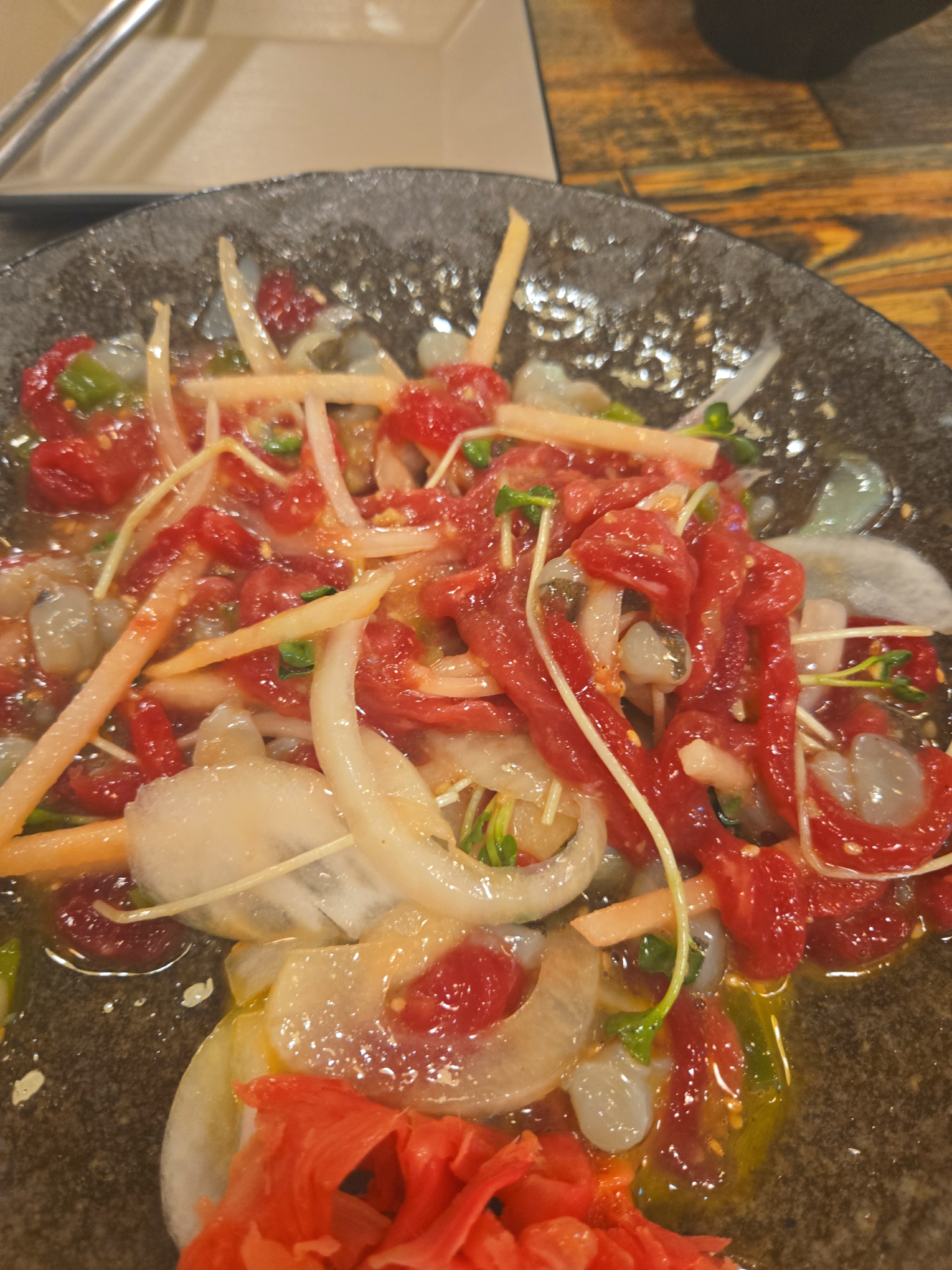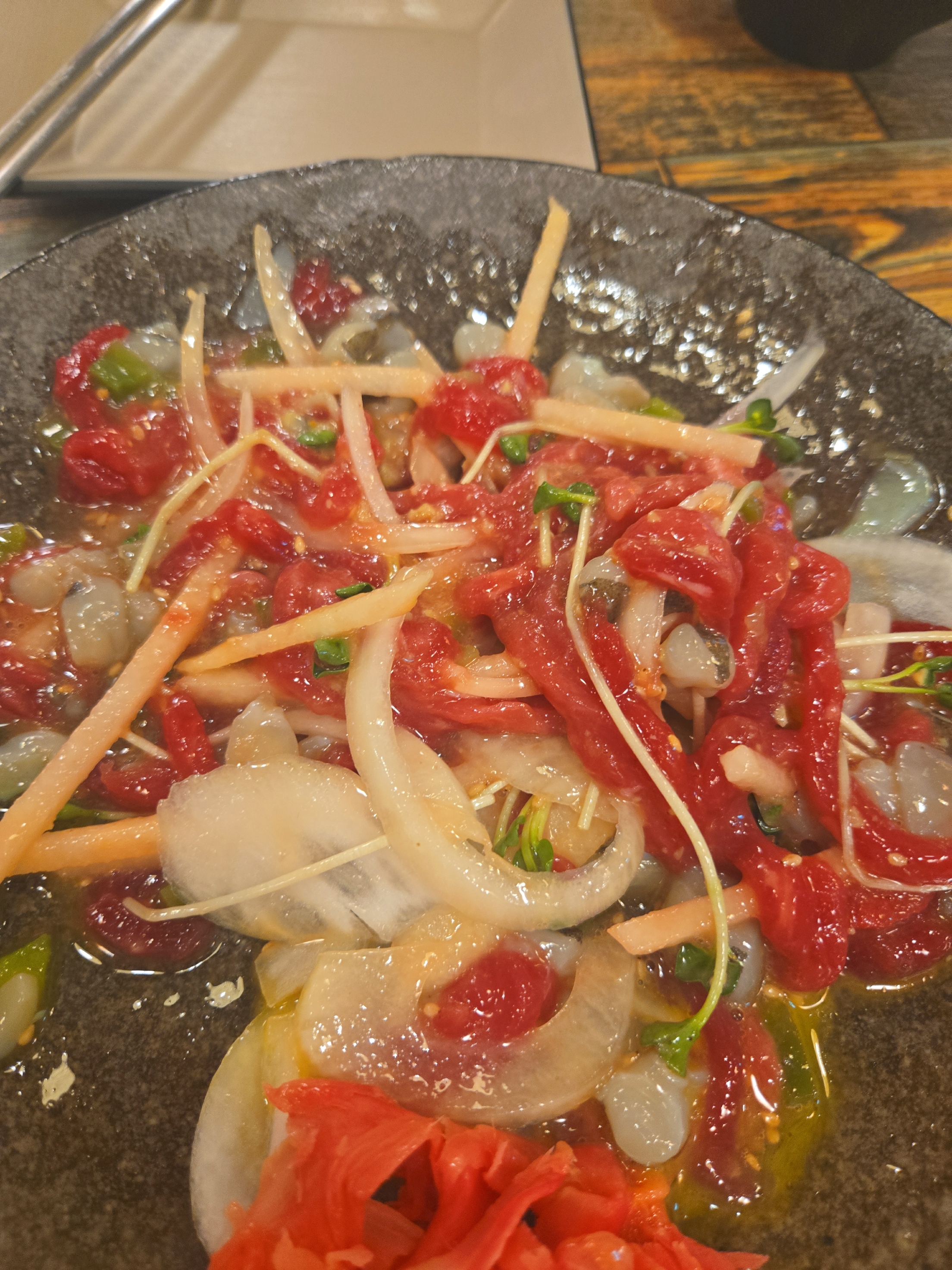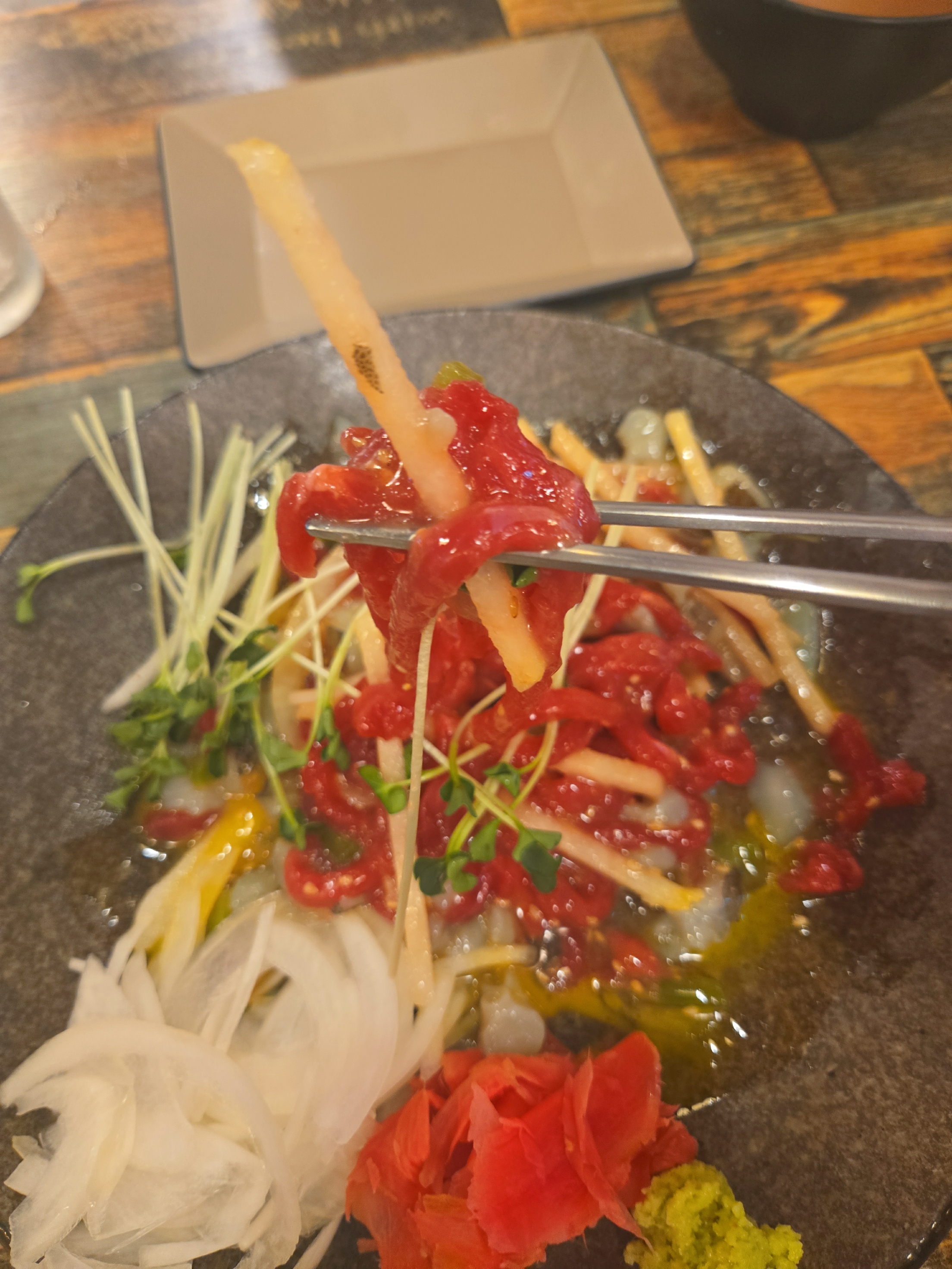 보기에도 아주 땟깔이 좋죠? 저희는 육회와 낙지 탕탕이를 같이 먹을 수 있는걸 선택했어요 약간 톡쏘면서 참 맛나네요~ 여기 사장님이 육회에 진심인듯 합니다. 육회바른연어는 육회를 비롯하여 연어초밥이 주를 이루고 있지만 사이드메뉴도 적절히 들어가있어서 2차, 3차하기 딱 좋은집입니다. 하지만 전 1차를 했지요 하하하