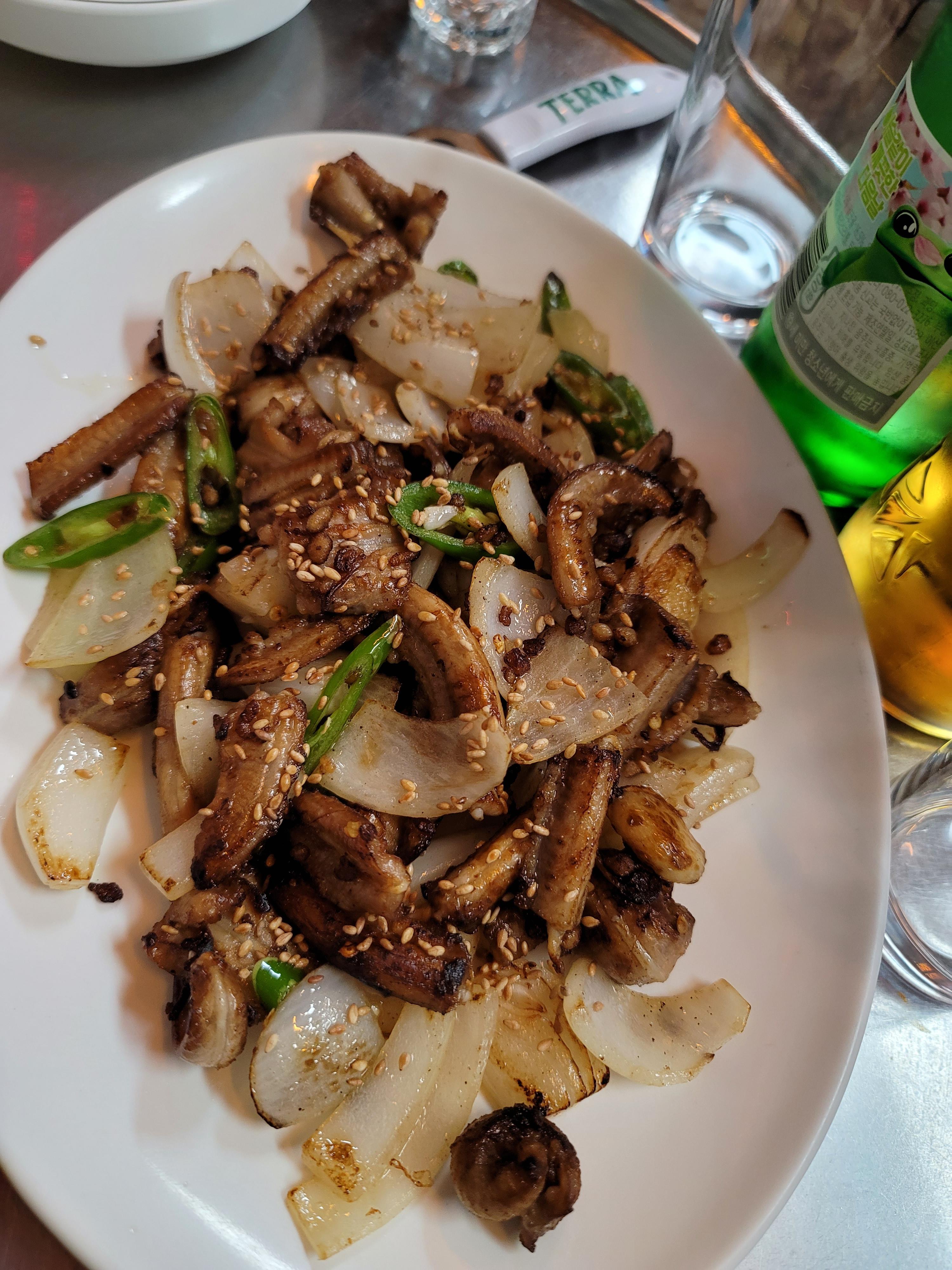이집에서 꼭 먹어봐야 하는것중 꼼장어도 있습니다. 꼼장어는 양념 소금 두가지인데 둘다 맛있어요~ 위에 사진은 해물파전인데 전에 찍어놓은 사진중 발견해서 같이 올려봅니다. 비쥬얼 너무 좋죠? 매콤한거 좋아하시는 분들은 음식에 청양고추가 들거가니 아마 만족도가 높으실꺼에요~~ 칼칼하니 진짜 술안주로 재격입니다. 느끼함은 1도 없는 안주 맛집입니다.