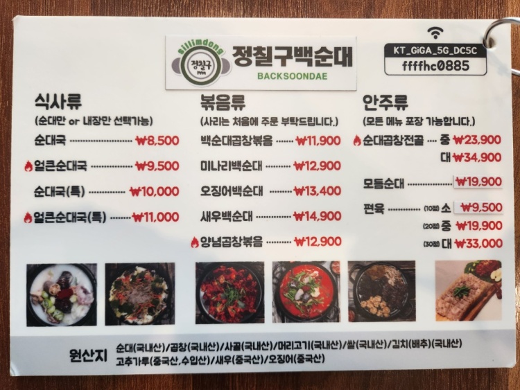 퇴근후 곱창전골이 너무 먹고싶어서 찾아간 정칠구 백순대 검단점 입니다. 원래 백순대 볶음이 주 메뉴인데 곱창전골도 팔더라구요. 전골이 너무 먹고싶어서 오늘은 전골을 시켰습니다.
