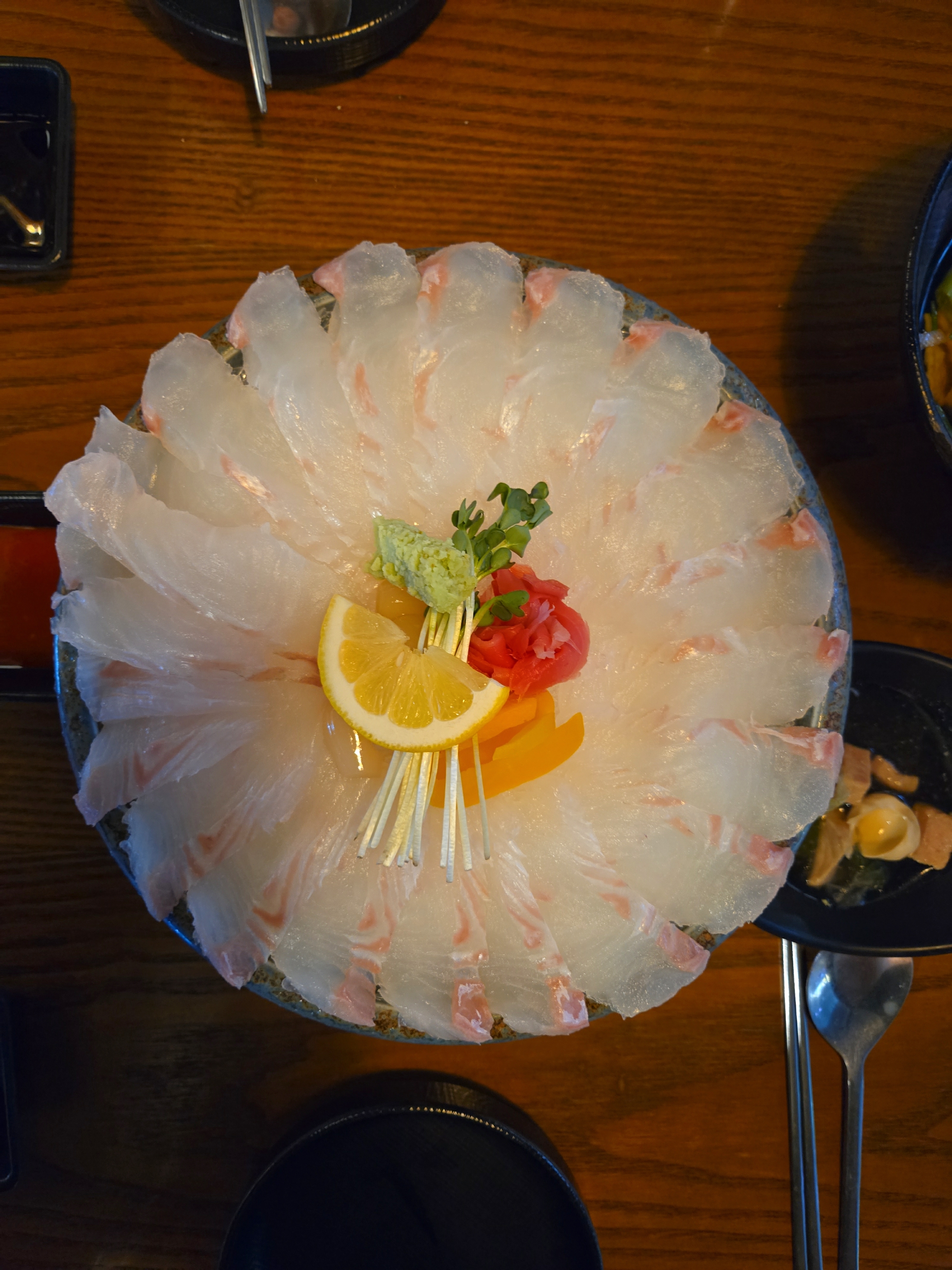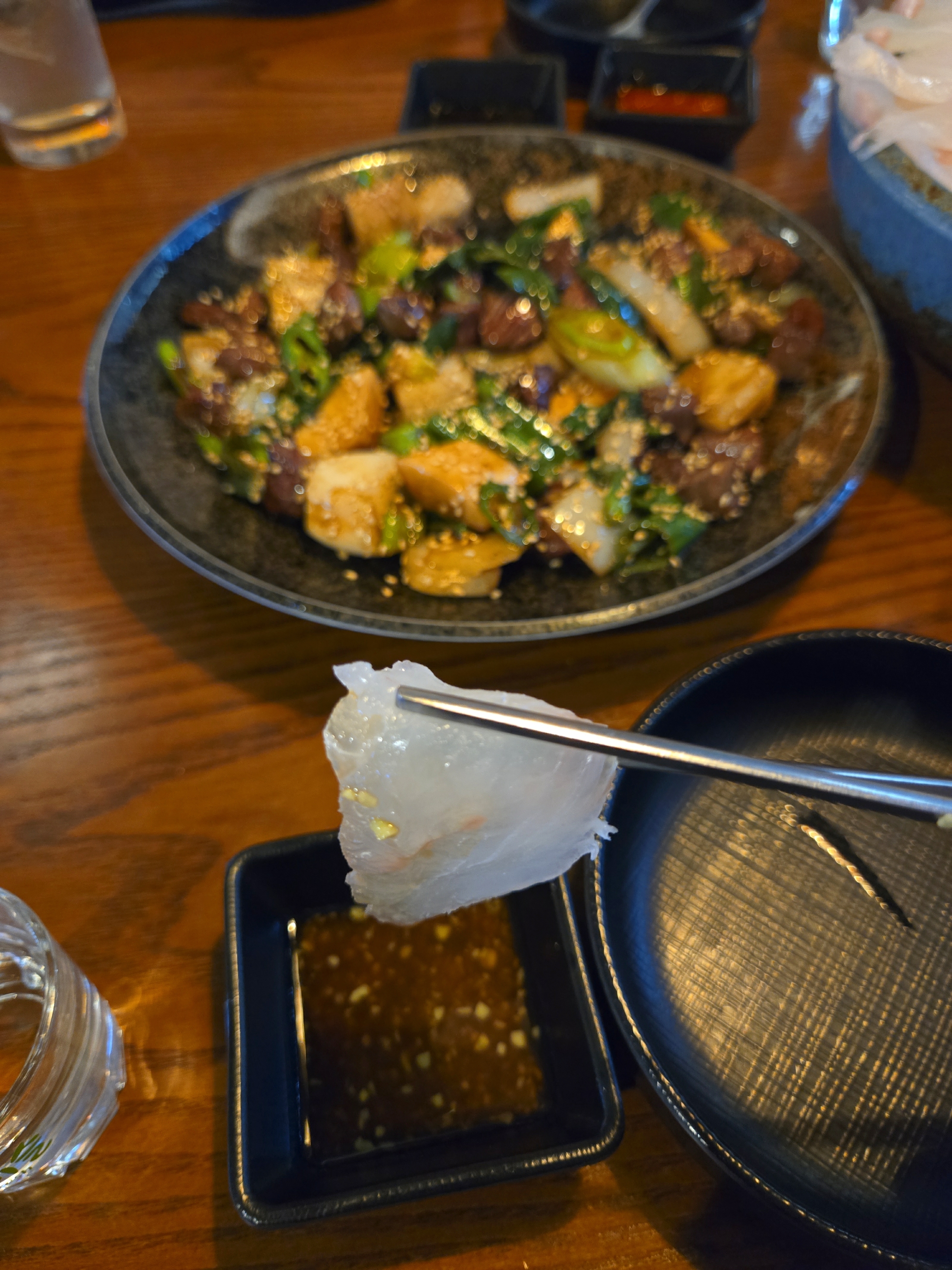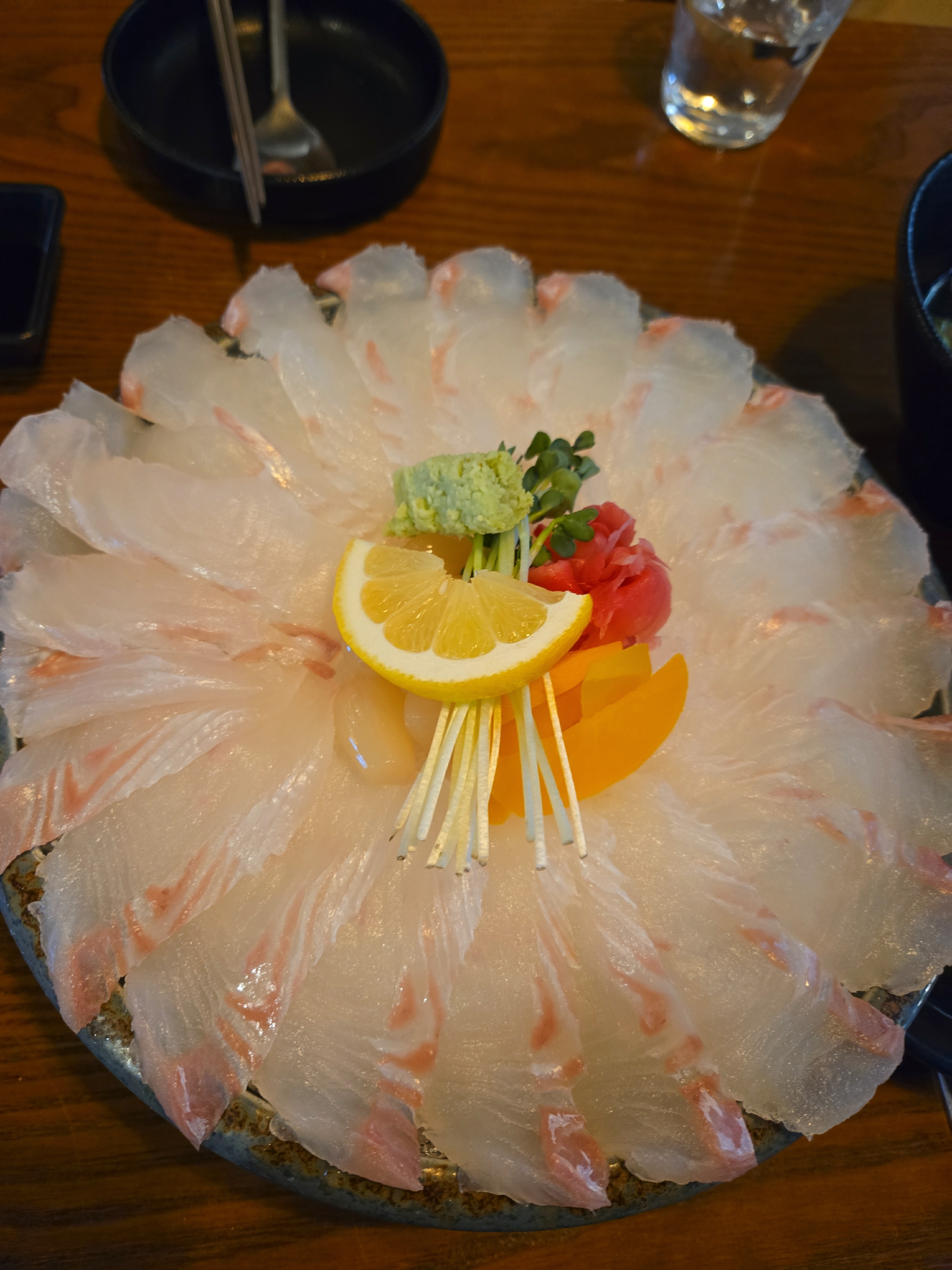 오랜만에 사시미를 먹었는데 입에서 살살 녹더라구요~ 개인적으로 너무 두툼한 회보다는 얇은걸 선호하는 쪽이라 사시미회는 제 입맛에 너무 딱이었어요 그렇다고 너무 얇지도 않은두께라 씹는맛도 좋았습니다.