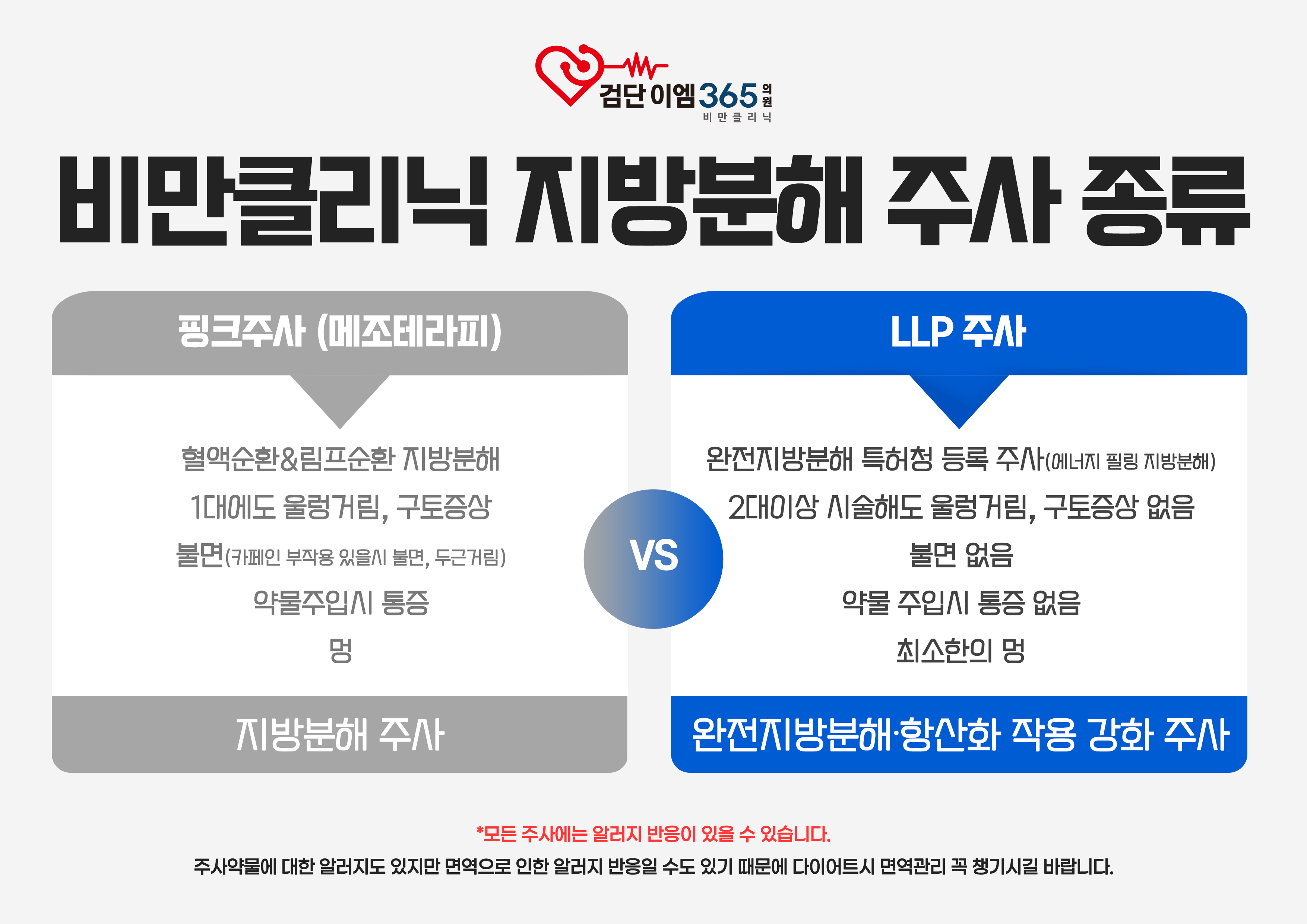LLP주사는 최근에 나온 주사로 핑크주사를 보안해서 나왔다고 보시면 됩니다. 대부분 고객분들은 LLP 주사를 더 선호하십니다. 가격이 좀 비싸긴 하지만 효과면에서는 항산화 작용을 해주는 약물이 들어가기 때문에 살빼시는 분들에게 많은 도움이 되실 수 있습니다. 통증이나 멍또한 거의 없어서 저희병원에서는 LLP주사를 가장 많이 하고 있습니다.