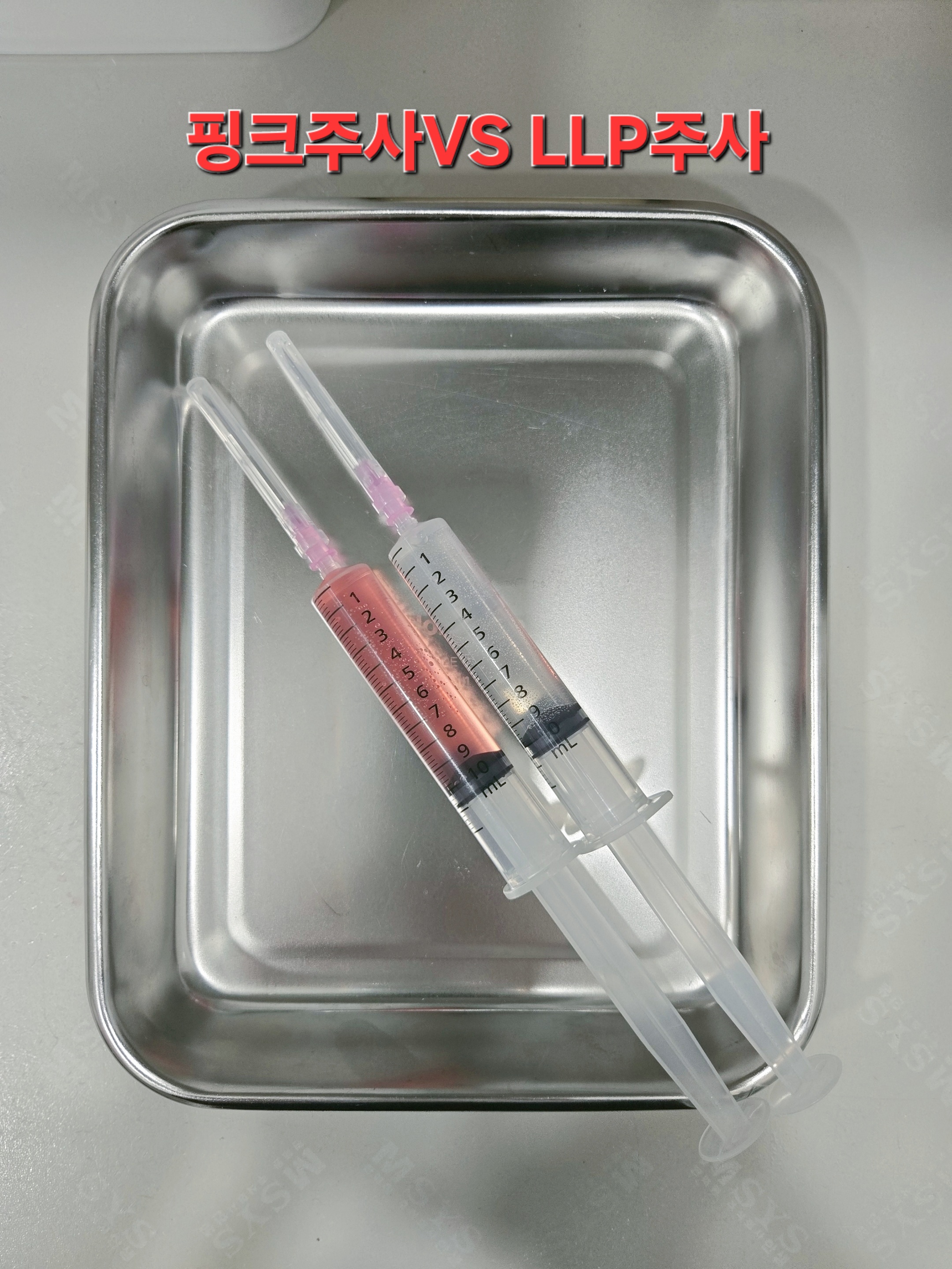 저희병원에서 시술하고 있는 주사는 2가지 종류입니다. 핑크색을 띄고 있는게 핑크주사, 흰색을 띄고 있는게 LLP주사 입니다. 각각 10cc씩의 용량입니다. 여러군데를 조금씩 나누어 놔드리고 있습니다.